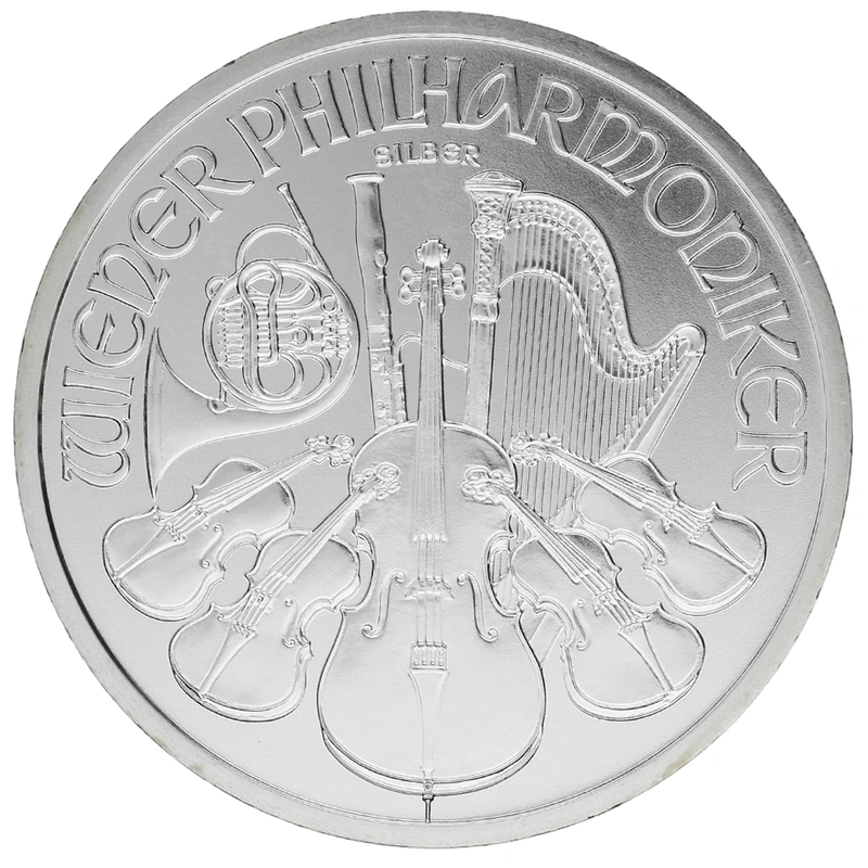 Designen är densamma som den klassiska guldversionen och hyllar Wiens rika musiktradition. Framsidan visar den berömda orgeln i Musikverein, konserthallen där Wienerfilharmonikerna uppträder. Ovanför orgeln står “REPUBLIK ÖSTERREICH” och under återfinns vikt, finhet och årtal. Baksidan pryds av en samling musikinstrument: violiner, cello, harpa, horn och fagott, tillsammans med texten “WIENER PHILHARMONIKER”.