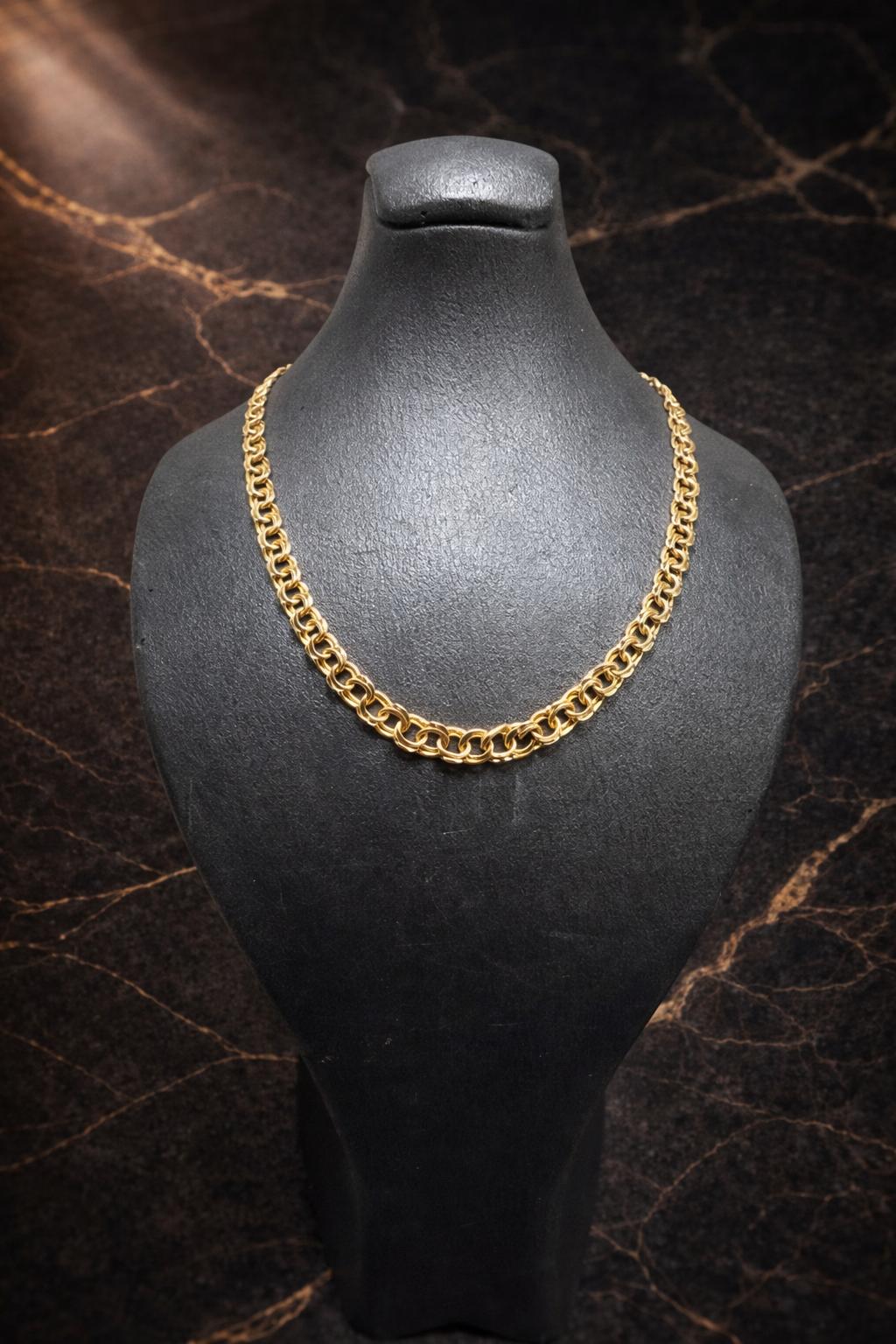Detta eleganta halsband i klassisk bismarck-design är tillverkat i äkta 18K guld och utstrålar både styrka och exklusiv skönhet. Den täta och karakteristiska länkningen ger halsbandet en lyxig tyngd, vacker glans och ett smidigt fall runt halsen.