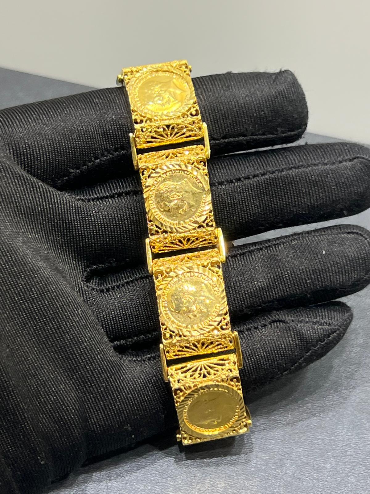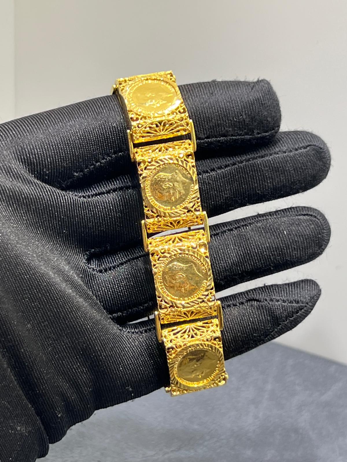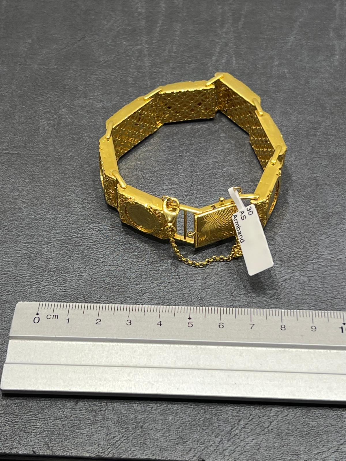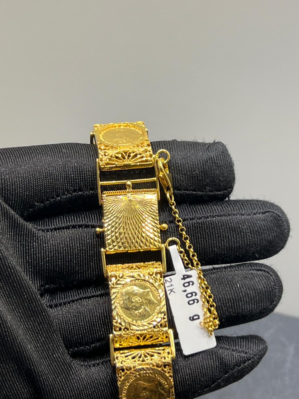 Ett elegant armband tillverkat i 21K guld som utstrålar tidlös stil och exklusivitet. Den höga guldhalten ger smycket en djup, varm färg och en naturlig glans som framhäver dess form och detaljer.