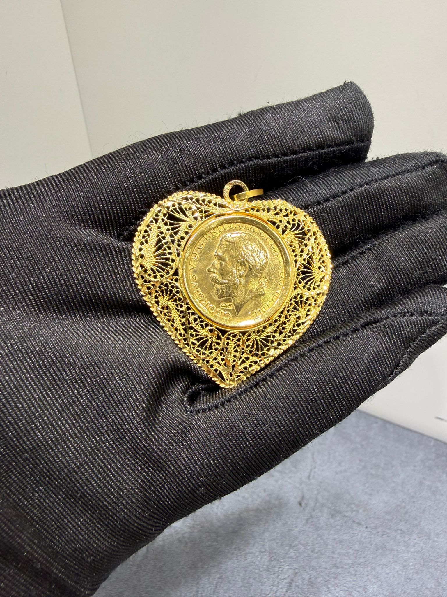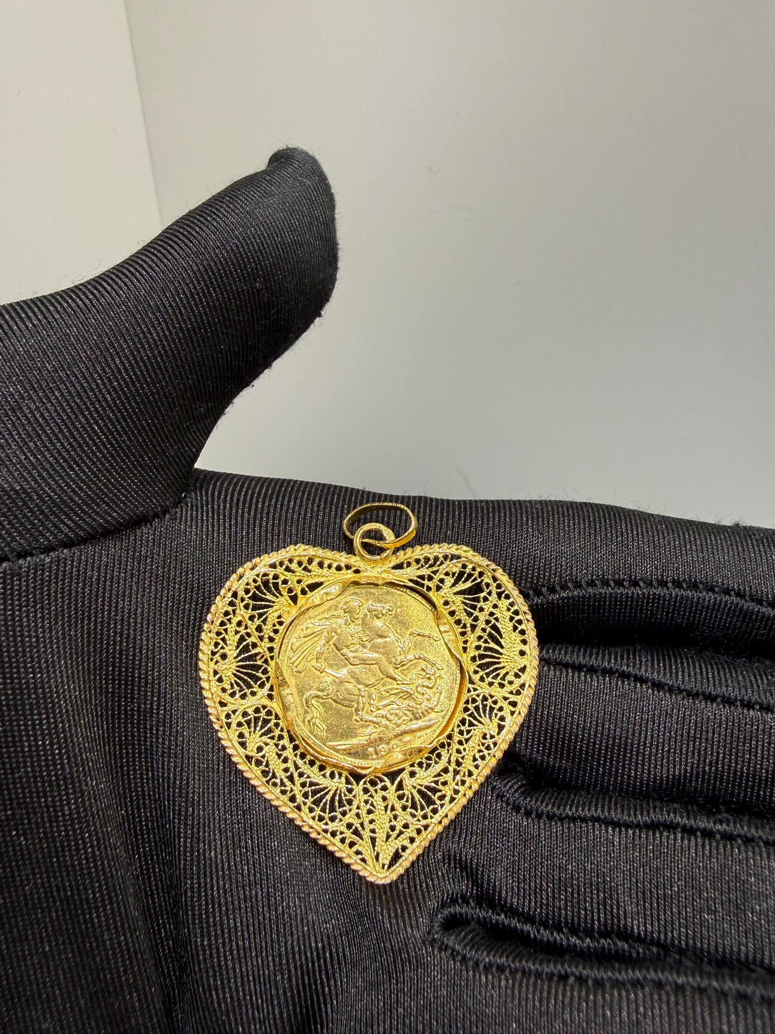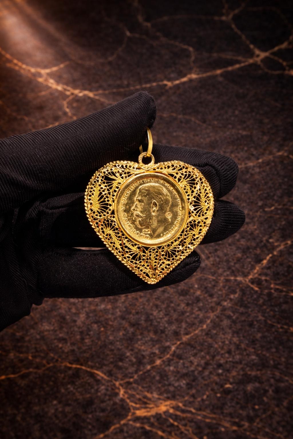 Brittiskt guldmynt monterat i en dekorativ ram tillverkad i 21 karat guld. Kombinationen av mynt och guldram ger smycket ett klassiskt och elegant utseende som ofta används som hänge till halsband.