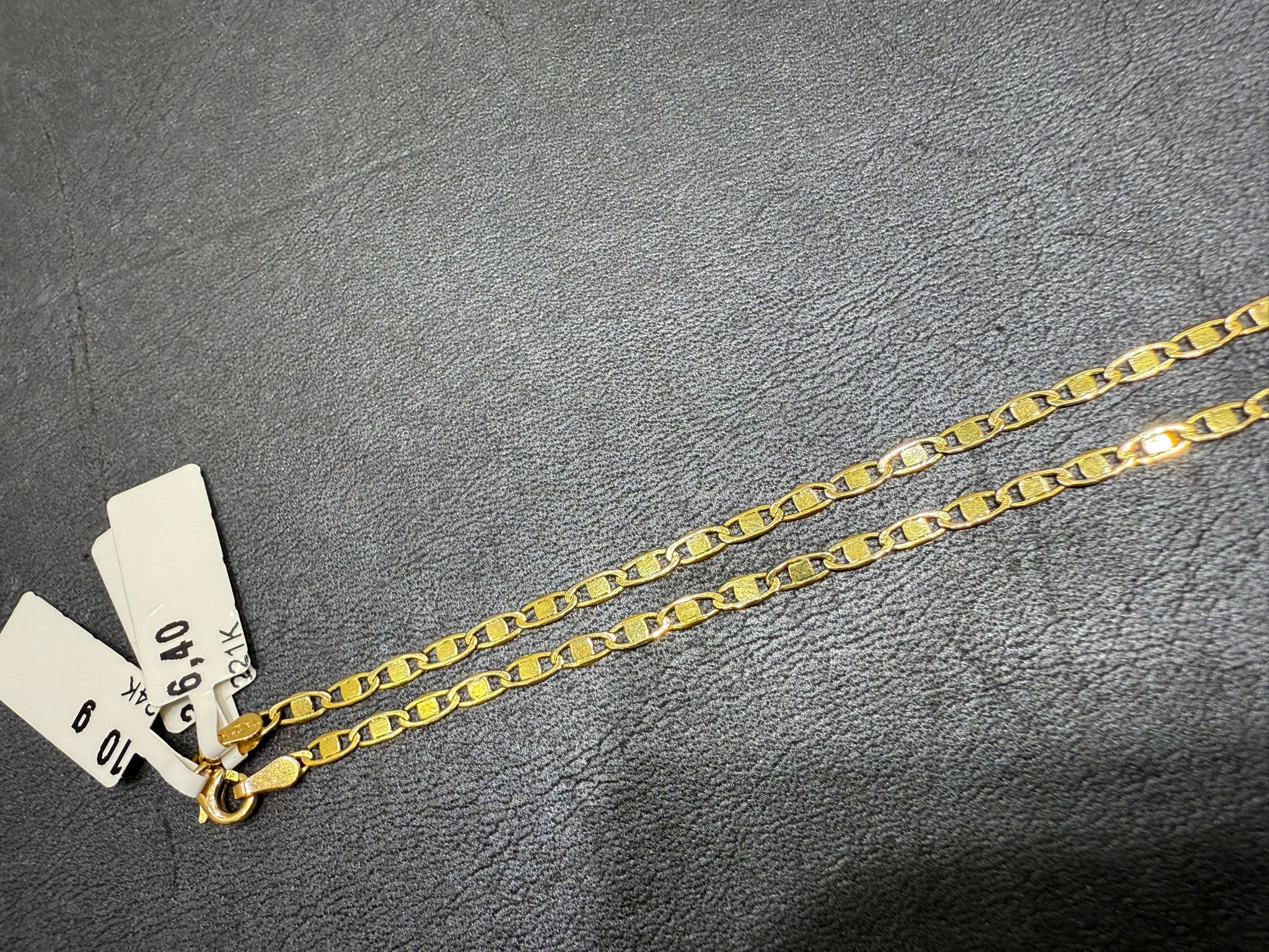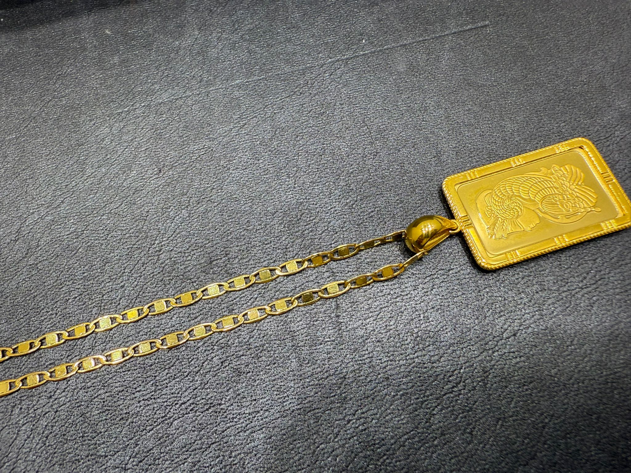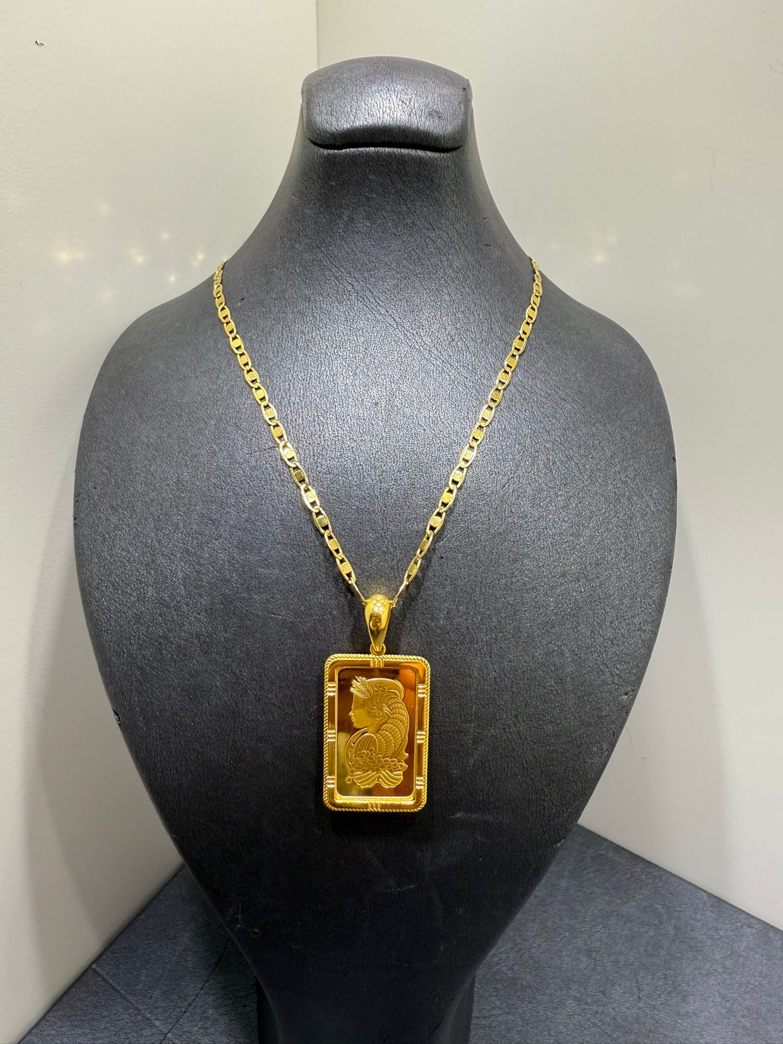Detta exklusiva halsband i 21K guld kombineras med en guldtacka i äkta 24K guld om 10 gram och erbjuder en elegant balans mellan smycke och investering.