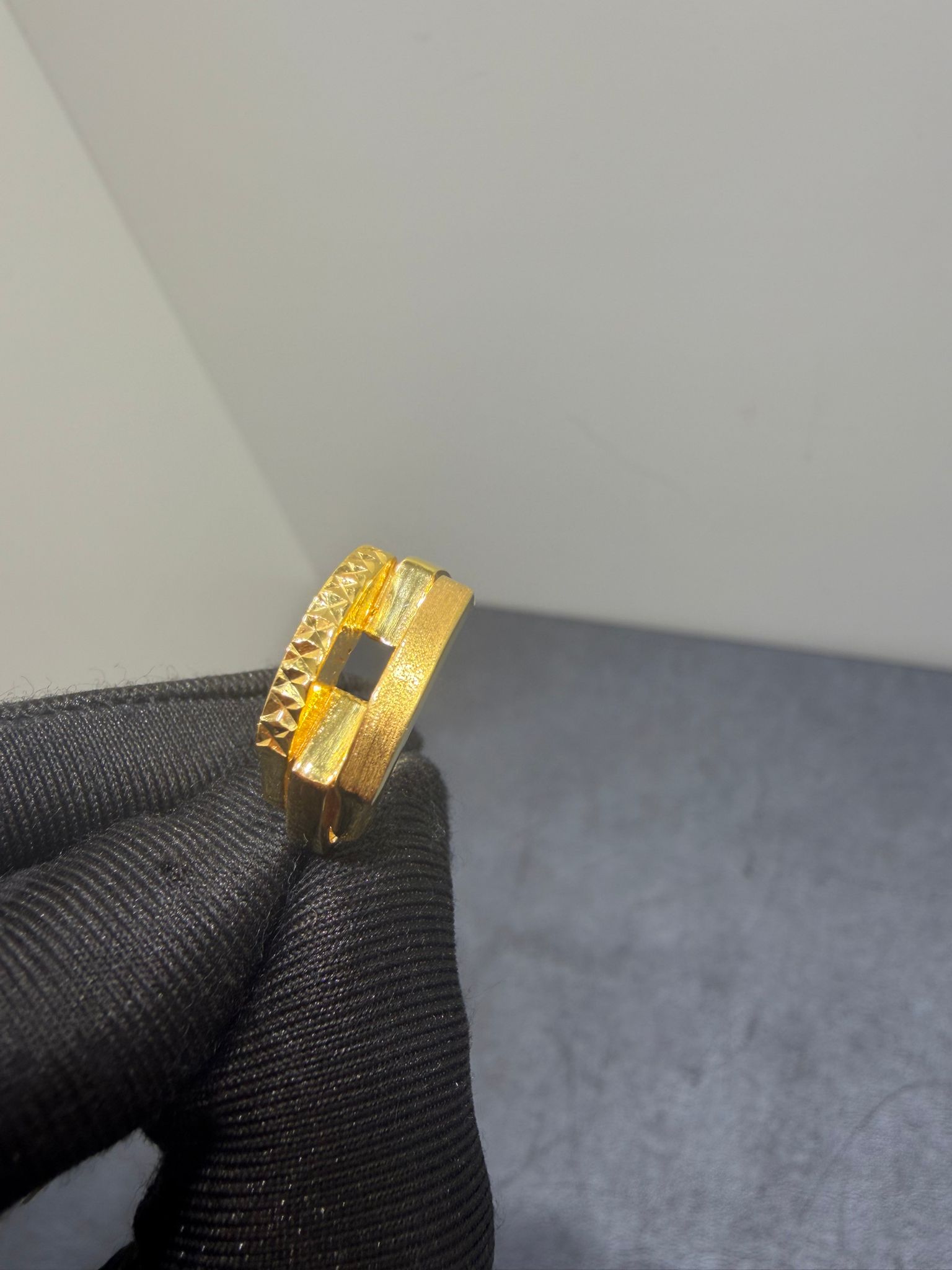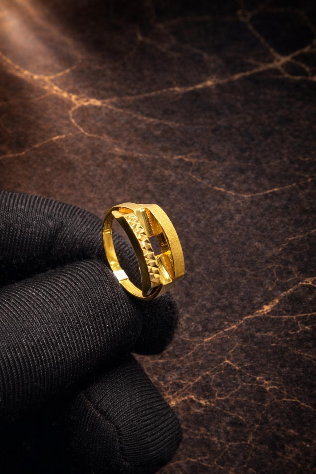 Elegant begagnad ring tillverkad i 21K guld. Varje ring har sin unika karaktär och charm, med små tecken på tidigare användning som ger den historia och personlighet. Perfekt för dig som vill bära en tidlös och exklusiv accessoar med genuin känsla.
