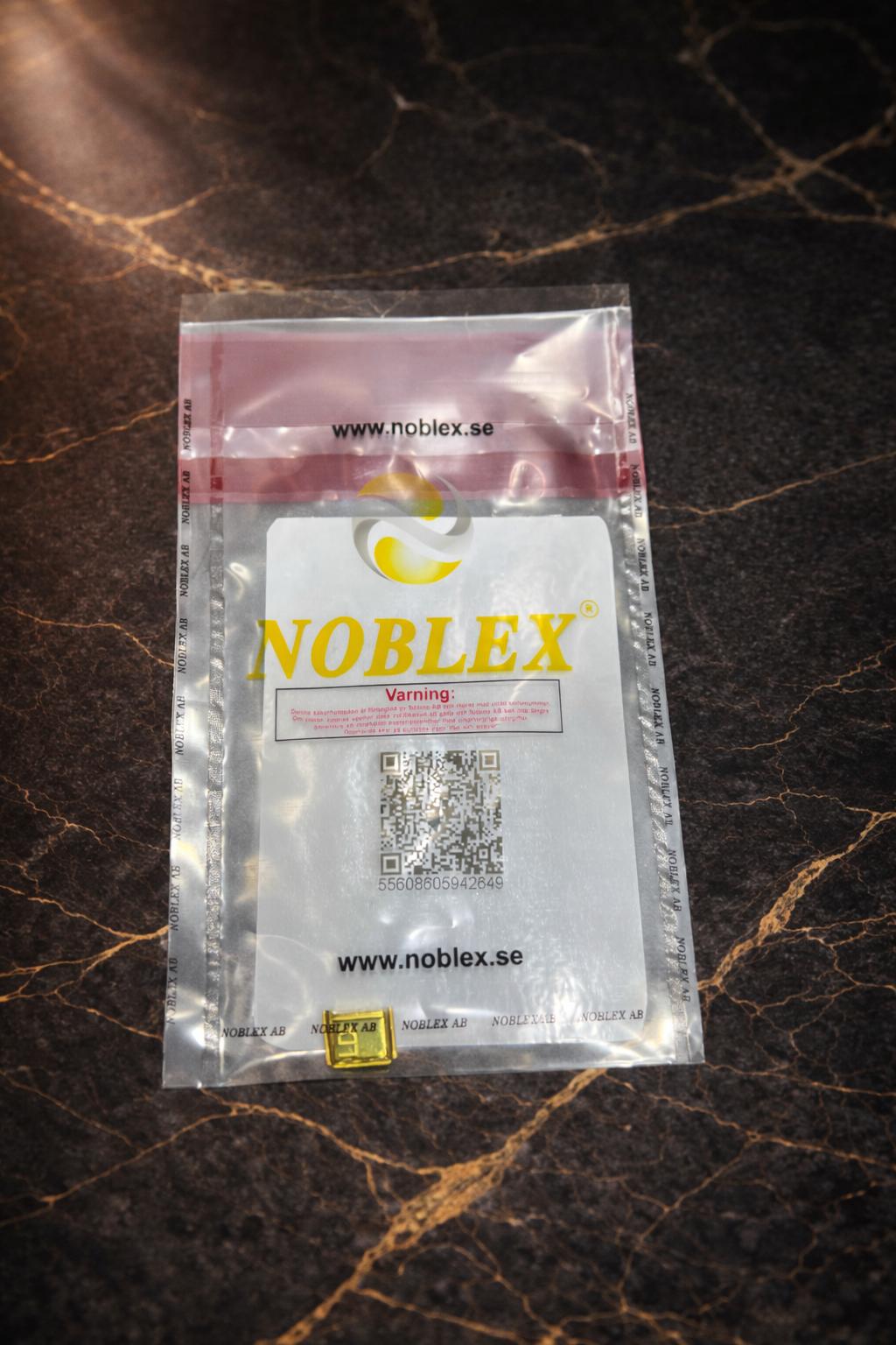 På certifikatet finns en unik QR‑kod som kan skannas med mobilen. Kunden slussas då direkt till Noblex AB:s verifieringssida, där total vikt, renhet och produktinformation bekräftas digitalt. Detta ger full transparens och trygghet vid varje köp.
