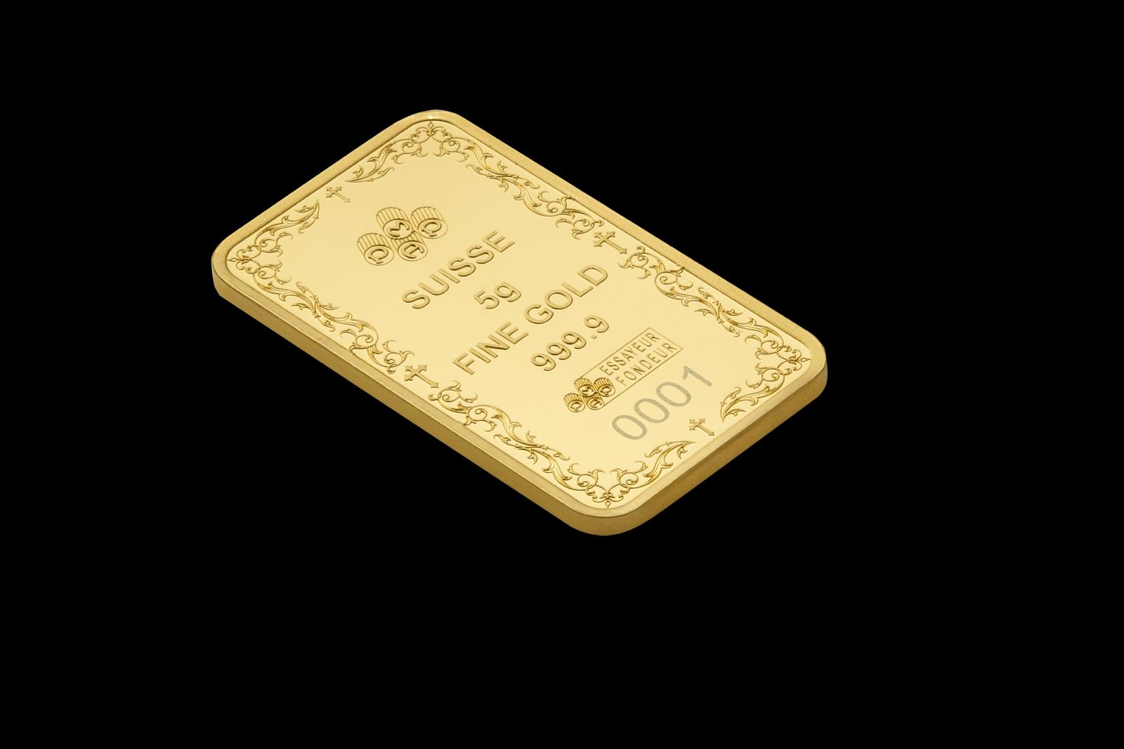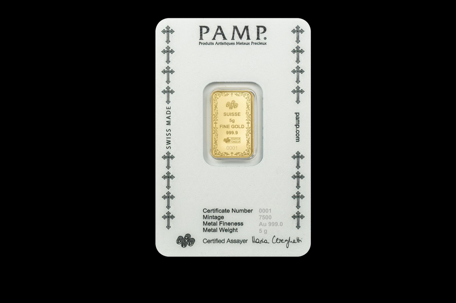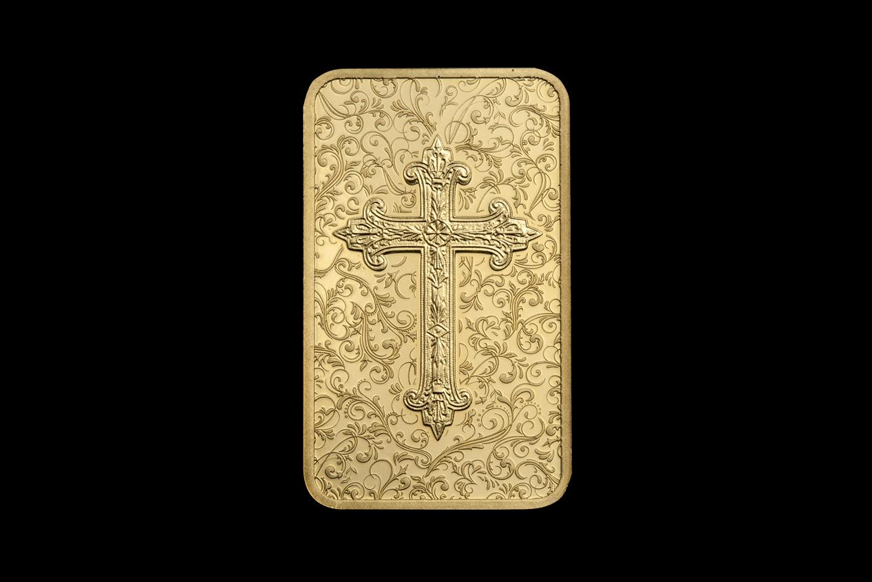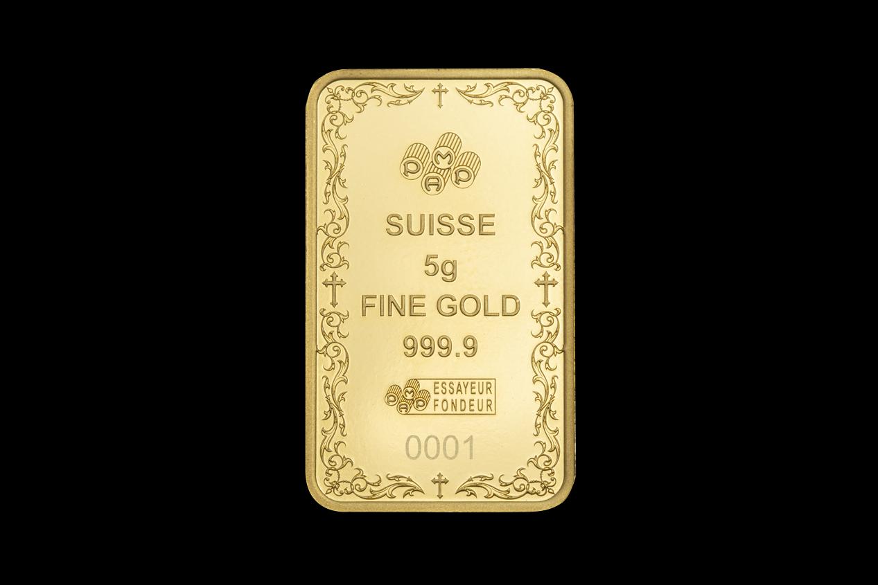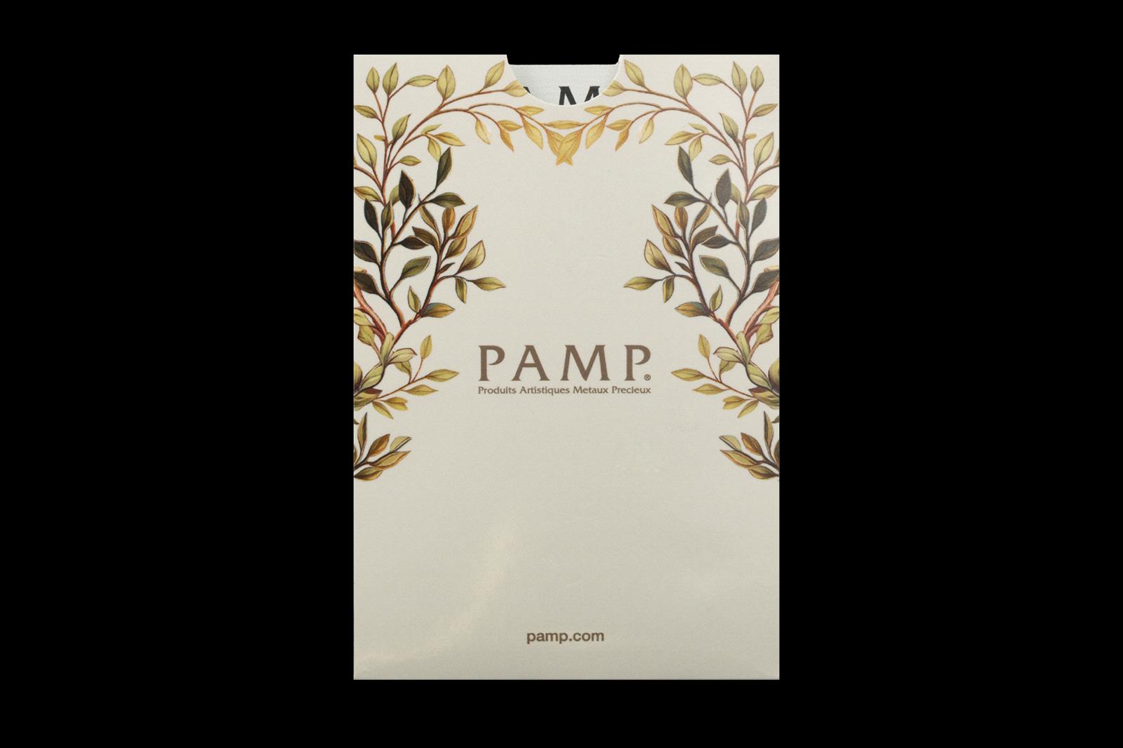 Framsidan pryds av PAMP Suisses ikoniska logotyp tillsammans med tydliga inskriptioner för vikt, renhet och finhalt. Dekorativa filigrandetaljer och små kors integreras i designen, vilket skapar en harmonisk balans mellan elegans och symbolik. Varje tacka är individuellt stämplad med ett serienummer som garanterar full spårbarhet.
