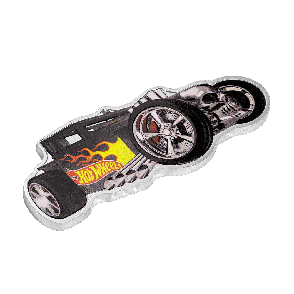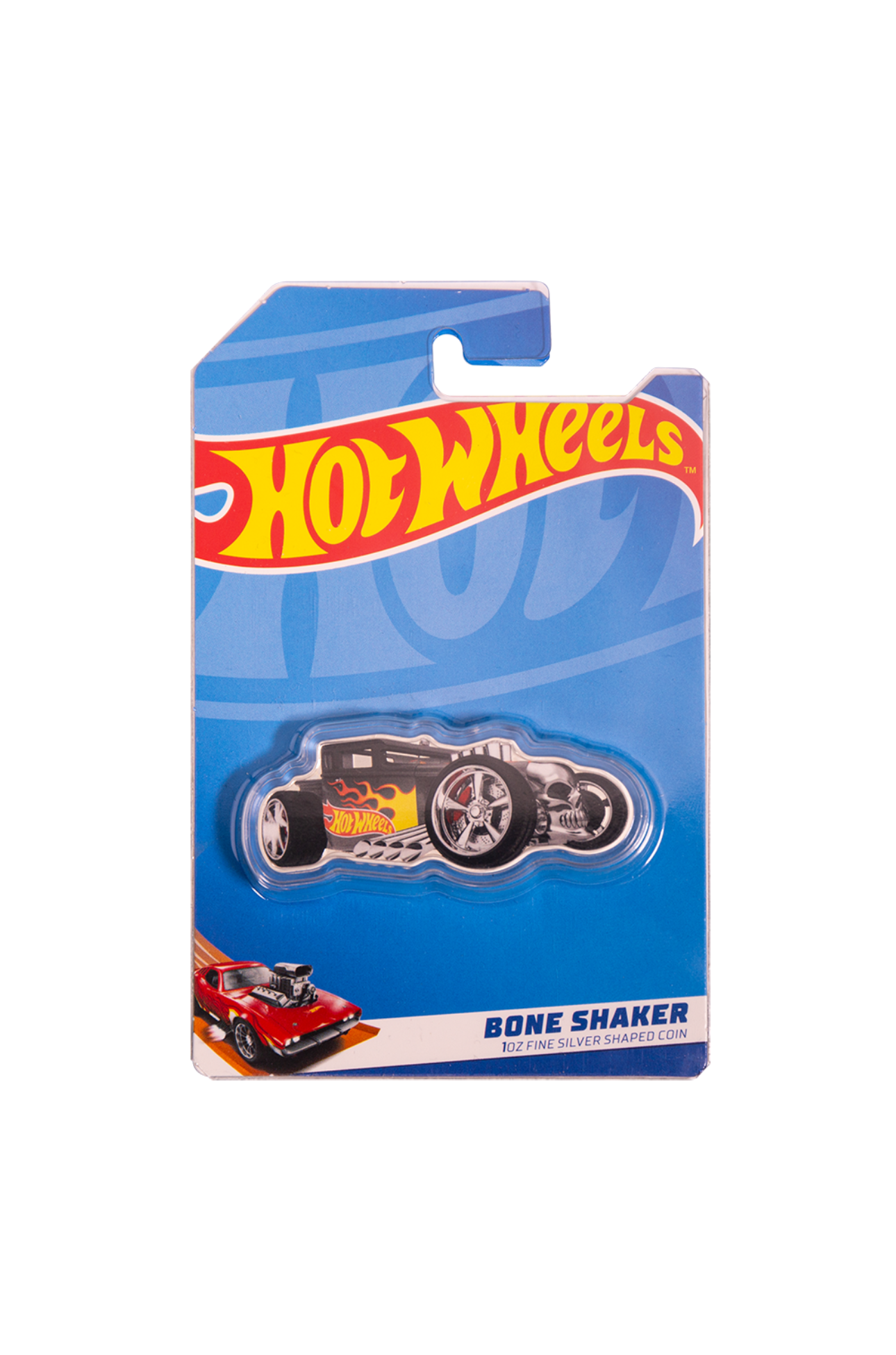 Bone Shaker designades av den legendariska Hot Wheels-designern Larry Wood och är en klassisk hot rod med ett distinkt och aggressivt utseende. Den karakteristiska dödskallegrillen och skelettliknande detaljer runt strålkastarna ger myntet en kraftfull och unik design, troget återgiven i rent silver.