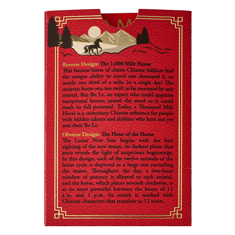 På framsidan av guldtackan avbildas den legendariska “Thousand Miles Horse”, känd i kinesisk mytologi för sin kraft och uthållighet, ett motiv som symboliserar beslutsamhet och framgångens väg. Hästen framställs i full rörelse, vilket fångar dess dynamiska energi och anda av oändliga möjligheter.